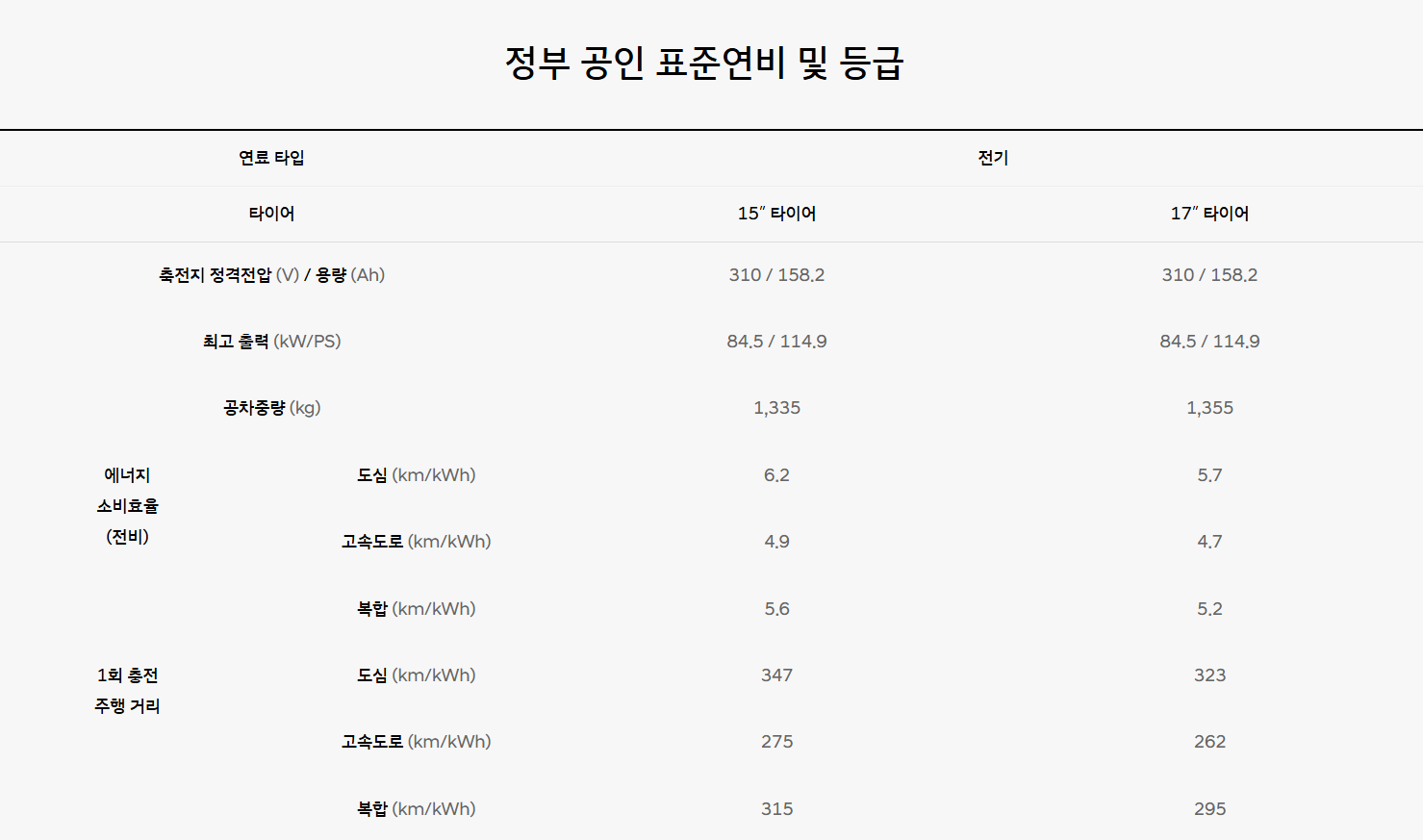 • 1회 충전 주행 거리 : 최대 315km (복합, 15인치 타이어 기준)