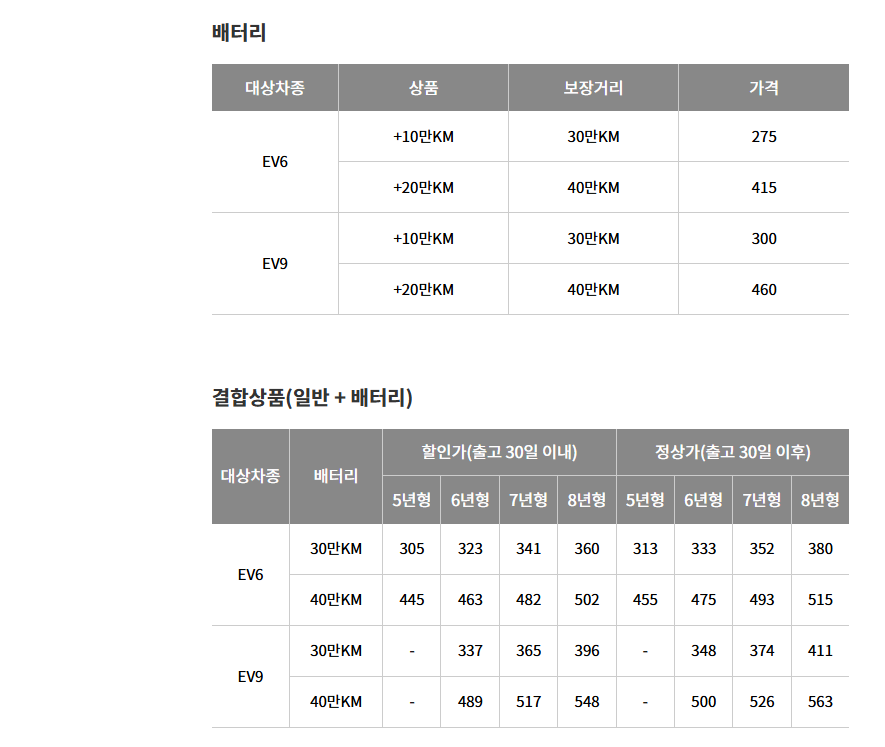 | 차량 모델 | 가격(원) | 보조금(원) | 기본 보증 (년) | 보증연장(년) | 배터리 용량(kWh) | 주행거리(km) |